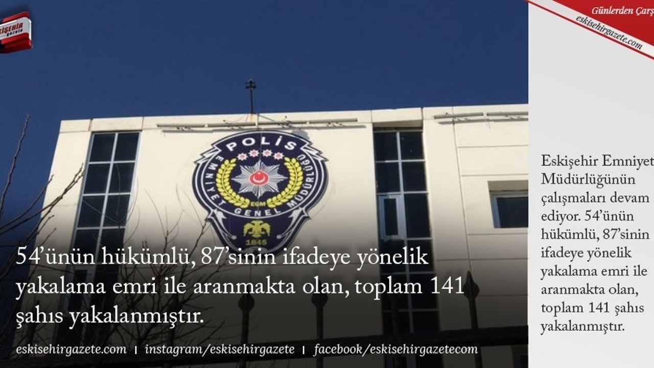 Eskişehir Emniyet Müdürlüğünün çalışmaları devam ediyor. 54'ünün hükümlü, 87'sinin ifadeye yönelik yakalama emri ile aranmakta olan, toplam 141 şahıs yakalanmıştır.