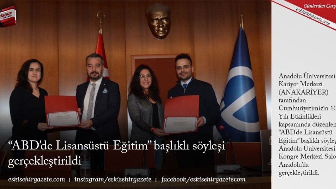 Anadolu Üniversitesi Kariyer Merkezi (ANAKARİYER) tarafından Cumhuriyetimizin 100. Yılı Etkinlikleri kapsamında düzenlenen 'ABD'de Lisansüstü Eğitim' başlıklı söyleşi Anadolu Üniversitesi Kongre Merkezi Salon Anadolu'da gerçekleştirildi.