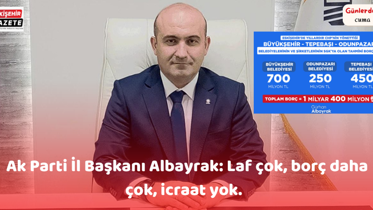AK Parti Eskişehir İl Başkanı Gürhan Albayrak, CHP'li belediyelerin SGK prim borçlarına ilişkin açıklamada bulundu. Lafın çok, icraatın ise az olduğunu vurgulayan Albayrak'ın açıklaması şu şekilde: