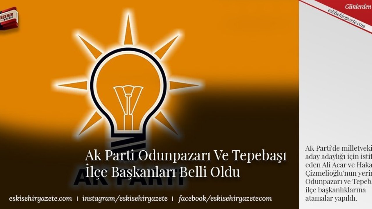 AK Parti'de milletvekili aday adaylığı için istifa eden Ali Acar ve Hakan Çizmelioğlu'nun yerine Odunpazarı ve Tepebaşı ilçe başkanlıklarına atamalar yapıldı. AK Parti'nin yeni Odunpazarı ilçe başkanı Ümit Sezer olurken, Tepebaşı ilçe başkanlığına ise Emre Aydın getirildi.