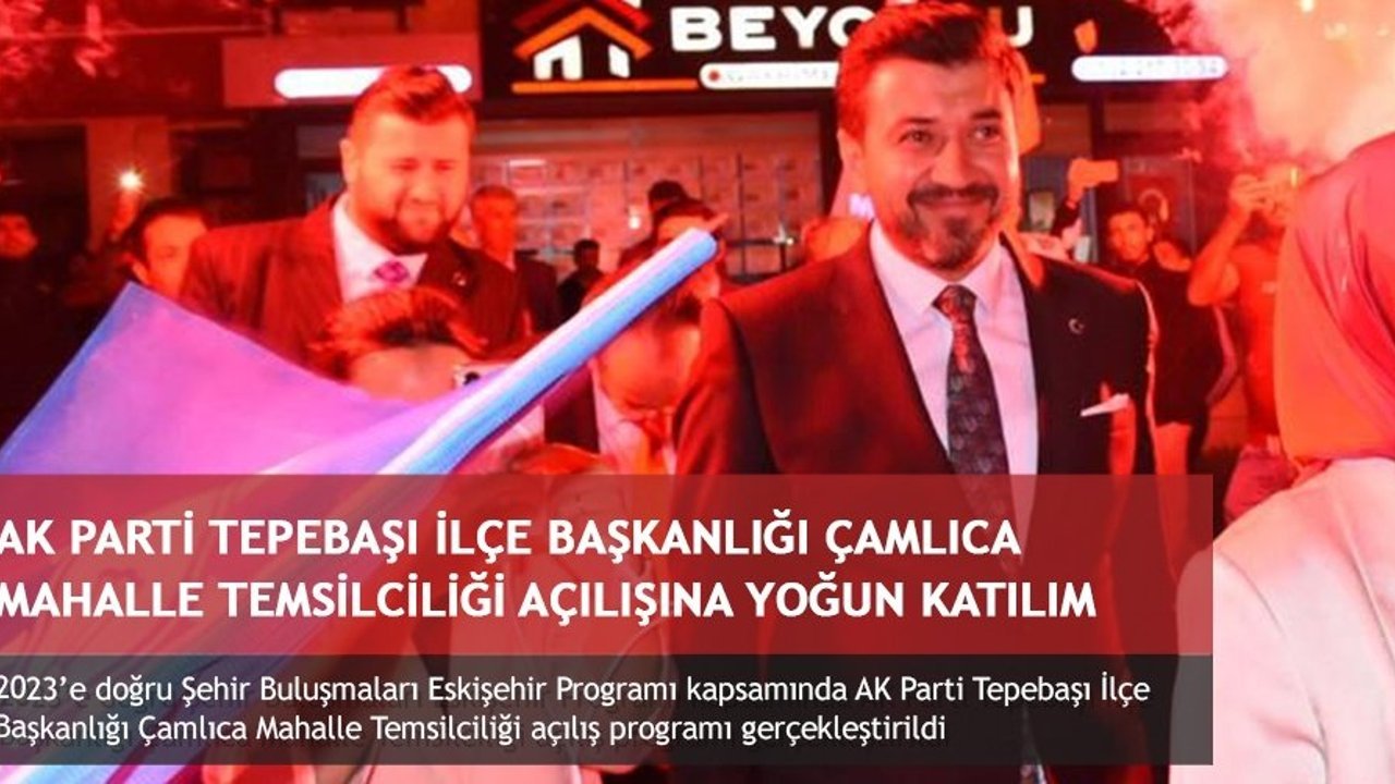'2023'e doğru Şehir Buluşmaları Eskişehir Programı kapsamında her ilçemizde programlar yapılmakta. Biz de bu anlamda 'Hedef 2023' diyerek, Bismillah dedik ve başladık. İlk mahalle temsilciliğimizi kısa bir süre önce Sütlüce-Yeşiltepe-Esentepe mahallerimiz için açmıştık. Rabbim nasip etti, bugün de ikinci mahalle temsilciliğimizi Çamlıca Mahallemizde açıyoruz. Durmadan yorulmadan AK Davamız için çalışan, emek veren teşkilat mensuplarımız ve hemşehrilerimiz ile birlikte ikinci mahalle temsilciliğimizin açılışını gerçekleştirmek için bir aradayız. Bu güzel ve özel günümüze, bizler ile birlikte heyecan ve sabırsızlık ile bekleyen AK davamızın gönüldaşları ikinci mahalle temsilciliğimizin açılışına hoş geldiniz.