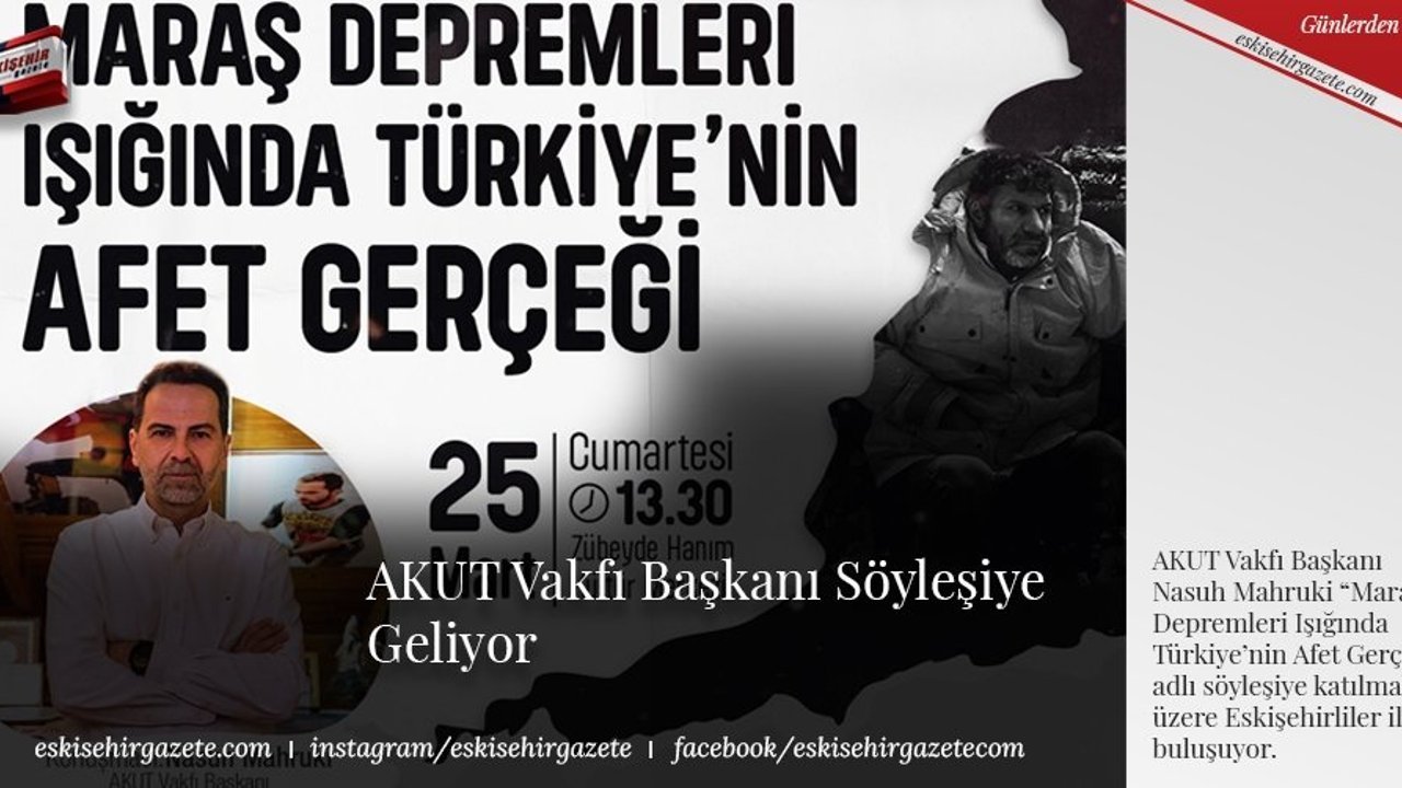 AKUT Vakfı Başkanı Nasuh Mahruki 'Maraş Depremleri Işığında Türkiye'nin Afet Gerçeği' adlı söyleşiye katılmak üzere Eskişehirliler ile buluşuyor.