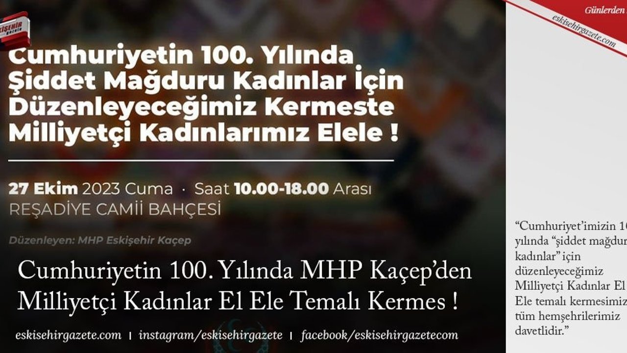 Cumhuriyet'imizin 100. yılında 'şiddet mağduru kadınlar' için düzenlenecek 'Milliyetçi Kadınlar El Ele' temalı kermese tüm Eskişehir halkının davetli olduğu Milliyetçi Hareket Partisi Eskişehir İl Teşkilatı sosyal medya hesaplarından duyruldu.