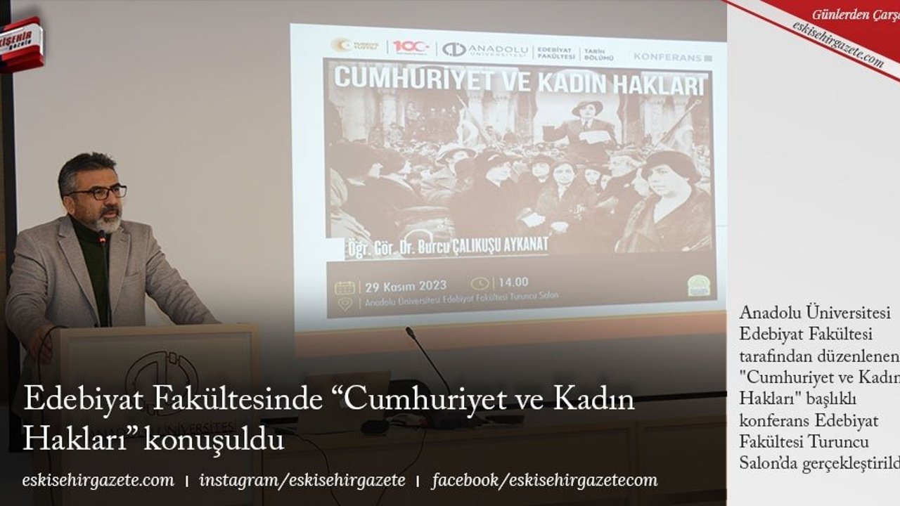 Anadolu Üniversitesi Edebiyat Fakültesi tarafından düzenlenen ''Cumhuriyet ve Kadın Hakları'' başlıklı konferans Edebiyat Fakültesi Turuncu Salon'da gerçekleştirildi.