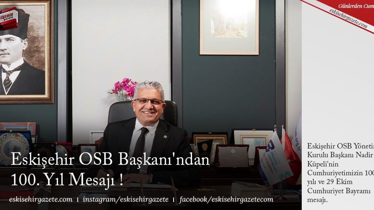 Eskişehir Organize Sanayi Bölgesi Yönetim Kurulu Başkanı Nadir Küpeli, Cumhuriyetin 100. yılı ve 29 Ekim Cumhuriyet Bayramı dolayısıyla bir mesaj yayınladı.
