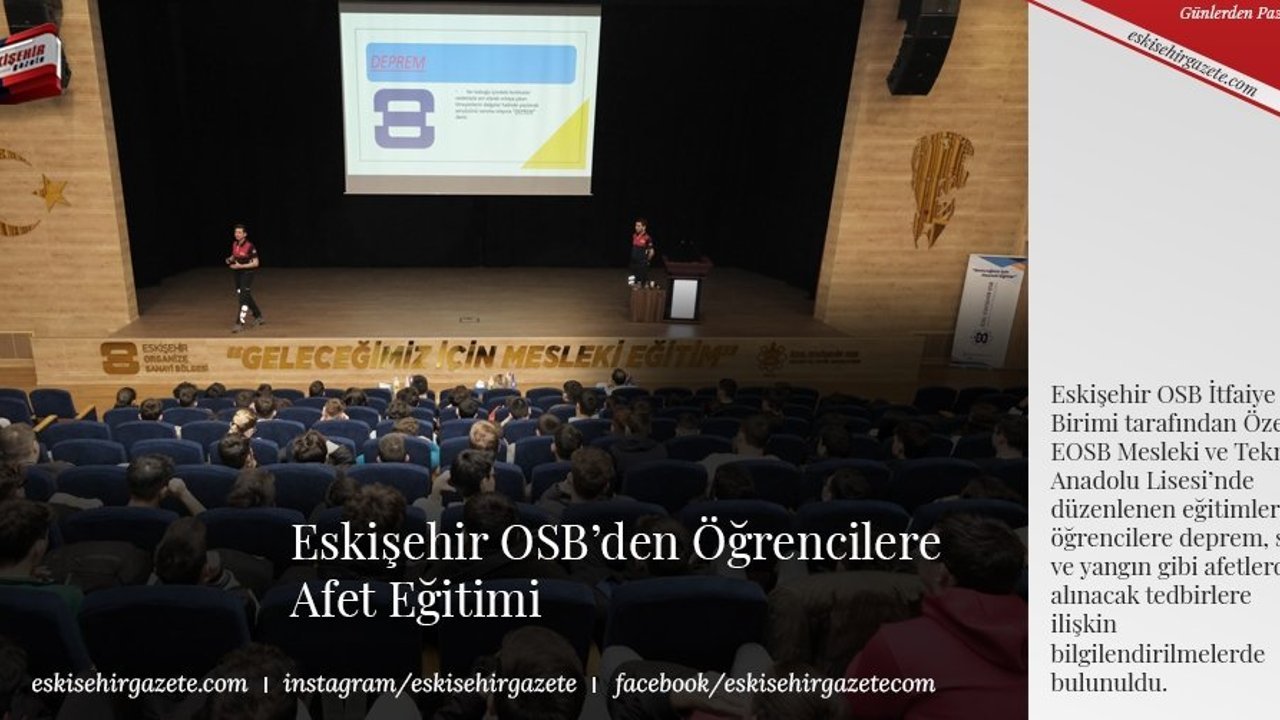 Ülkemizde yaşanan son deprem felaketlerinden sonra özellikle öğrencilerin bu konulardaki bilinç seviyesini arttırmak amacıyla Eskişehir OSB İtfaiye Birimi tarafından Özel EOSB Mesleki ve Teknik Anadolu Lisesi öğrencilerine afet farkındalık eğitimi verildi. Eskişehir OSB İtfaiye Yangın Savunma ve Afet Farkındalık Eğitmeni Sinan Altıntaş ve Eskişehir OSB İtfaiye Arama Kurtarma ve Afet Farkındalık Eğitmeni Can Kükrer tarafından verilen eğitimlerde deprem, sel ve yangın felaketleri ile ilgili afet öncesi alınacak tedbirler, afet anında ve sonrasında yaşanacaklar ile ilgili geniş kapsamlı bilgiler aktarıldı.