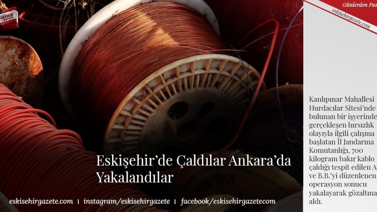 Edinilen bilgilere göre, İl Jandarma Komutanlığı'na bağlı Odunpazarı İlçe Jandarma Komutanlığı ve Jandarma Suç Araştırma Dedektif Timlerince (JASAT) Kanlıpınar Mahallesi Hurdacılar Sitesi'nde bulunan bir işyerinden gerçekleşen hırsızlık olayıyla ilgili çalışma başlatıldı. İşletmeden piyasa değeri yaklaşık 120 bin TL olan 700 kilogram bakır kablo çaldığı tespit edilen A.Ç. ve B.B.'nin, JASAT ekiplerinin takibi sonucu Ankara'da bulunan ikametlerinde olduğu tespit edildi.