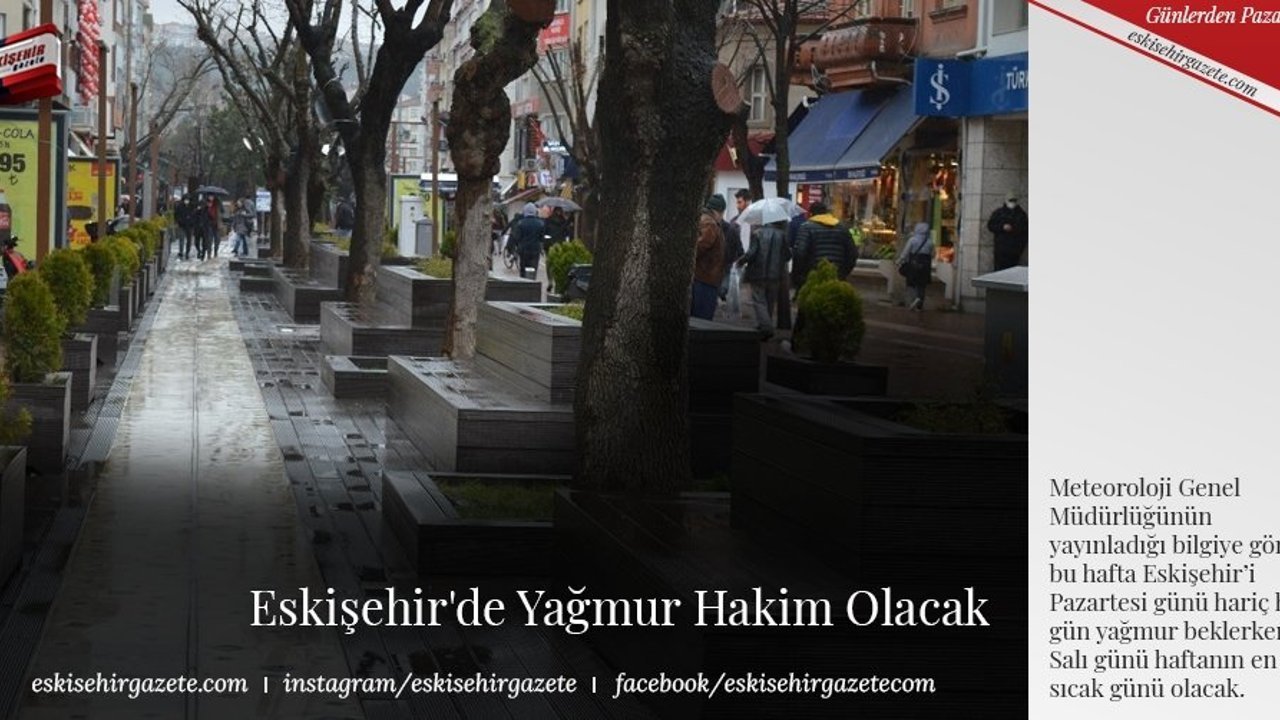 Meteoroloji Genel Müdürlüğünün yayınladığı bilgiye göre bu hafta Eskişehir'i Pazartesi günü hariç her gün yağmur beklerken, Salı günü haftanın en sıcak günü olacak.
