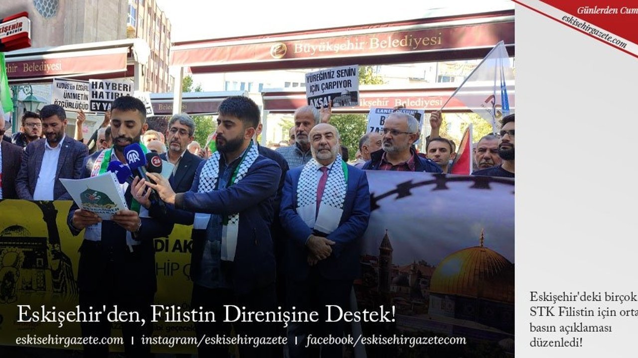Eskişehir'de bir araya gelen duyarlı STK'larca düzenlenen basın açıklamasıyla; HAMAS'ın siyonist rejime yönelik düzenlediği geniş kapsamlı Aksa Tufanı operasyonuna destek verilirken siyonist işgalcilerin zulmü telin edildi.
