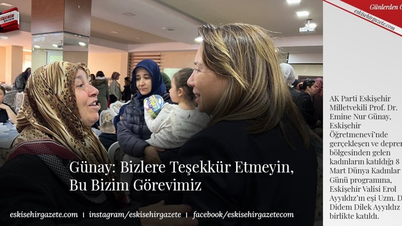 AK Parti Eskişehir Milletvekili Prof. Dr. Emine Nur Günay, Eskişehir Öğretmenevi'nde gerçekleşen ve deprem bölgesinden gelen kadınların katıldığı 8 Mart Dünya Kadınlar Günü programına, Eskişehir Valisi Erol Ayyıldız'ın eşi Uzm. Dr. Didem Dilek Ayyıldız ile birlikte katıldı.