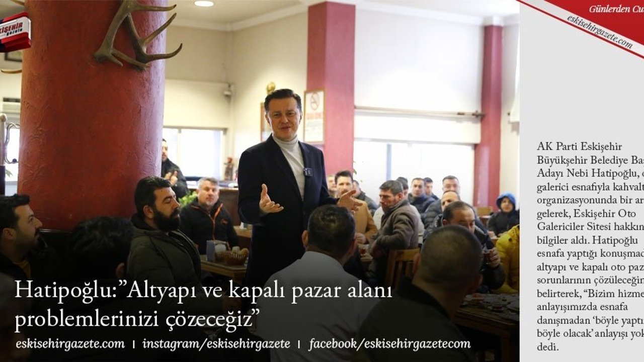 AK Parti Eskişehir Büyükşehir Belediye Başkan Adayı Nebi Hatipoğlu, oto galerici esnafıyla kahvaltı organizasyonunda bir araya gelerek, Eskişehir Oto Galericiler Sitesi hakkında bilgiler aldı. Hatipoğlu esnafa yaptığı konuşmada altyapı ve kapalı oto pazarı sorunlarının çözüleceğini belirterek, 'Bizim hizmet anlayışımızda esnafa danışmadan 'böyle yaptım böyle olacak' anlayışı yok' dedi.
