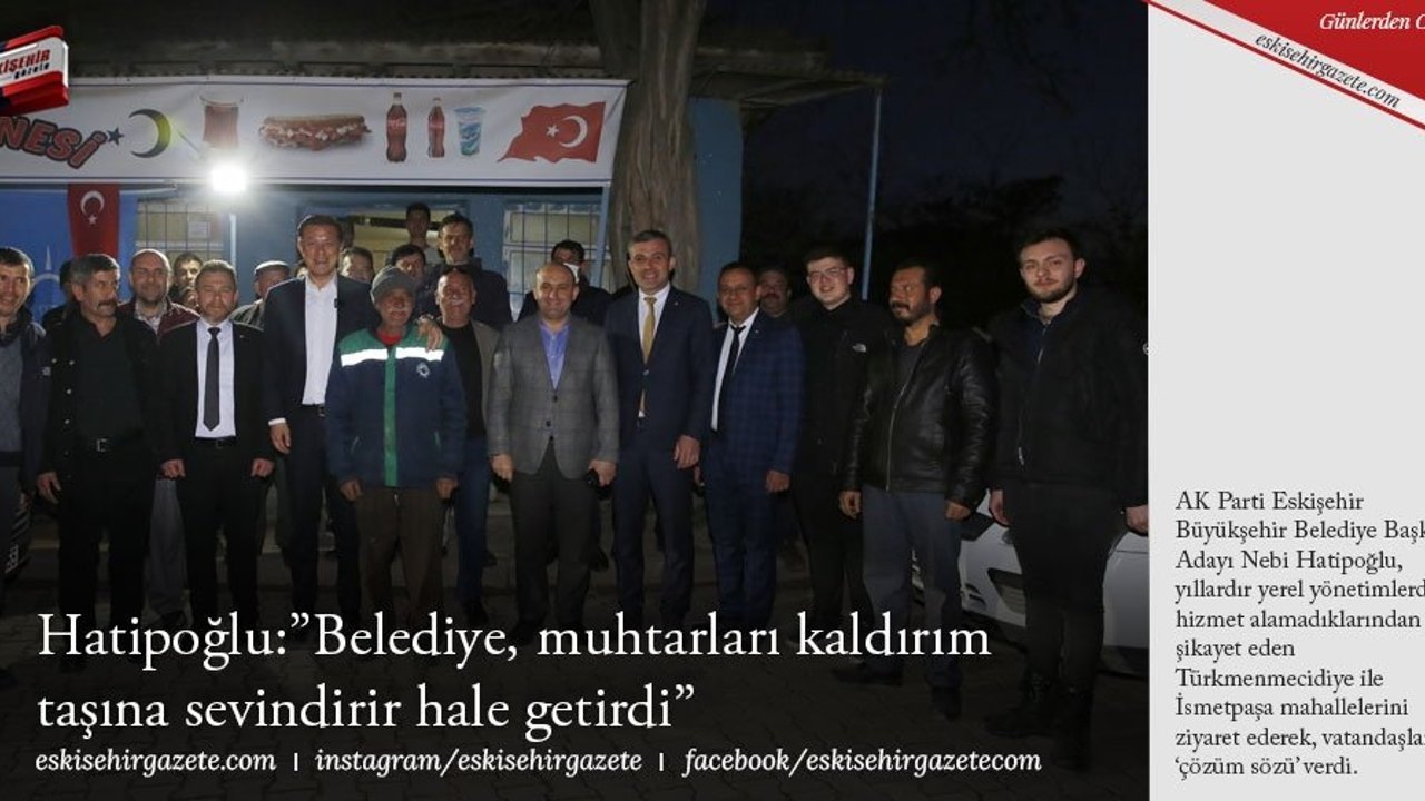 AK Parti Eskişehir Büyükşehir Belediye Başkan Adayı Nebi Hatipoğlu, yıllardır yerel yönetimlerden hizmet alamadıklarından şikayet eden Türkmenmecidiye ile İsmetpaşa mahallelerini ziyaret ederek, vatandaşlara 'çözüm sözü' verdi.