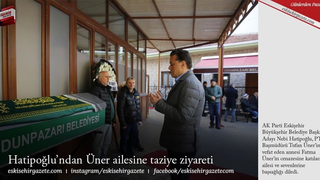 AK Parti Eskişehir Büyükşehir Belediye Başkan Adayı Nebi Hatipoğlu, PTT Başmüdürü Tufan Üner'in vefat eden annesi Fatma Üner'in cenazesine katılarak, ailesi ve sevenlerine başsağlığı diledi.