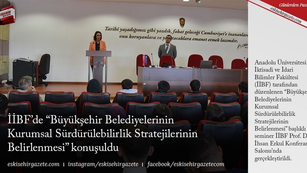 Anadolu Üniversitesi İktisadi ve İdari Bilimler Fakültesi (İİBF) tarafından düzenlenen 'Büyükşehir Belediyelerinin Kurumsal Sürdürülebilirlik Stratejilerinin Belirlenmesi' başlıklı seminer İİBF Prof. Dr. İhsan Erkul Konferans Salonu'nda gerçekleştirildi.