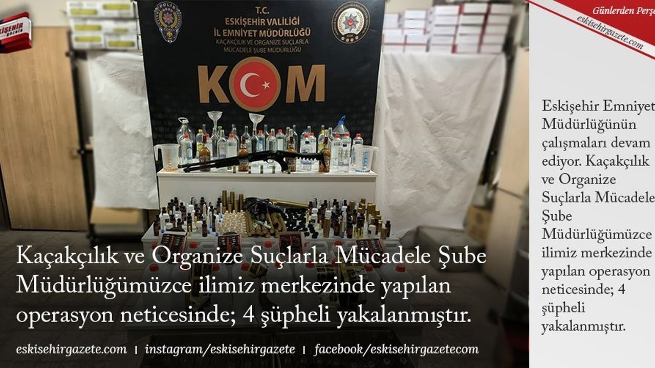 Eskişehir Emniyet Müdürlüğünün çalışmaları devam ediyor. Kaçakçılık ve Organize Suçlarla Mücadele Şube Müdürlüğümüzce ilimiz merkezinde yapılan operasyon neticesinde; 4 şüpheli yakalanmıştır.
