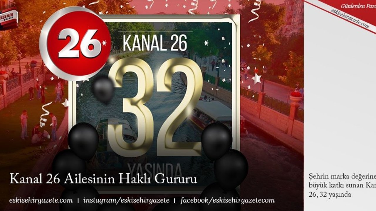 Eskişehir'in dünyaya açılan penceresi Kanal 26, 32. Yıldönümünü kutluyor. Eskişehir sevgisinden milli değerlerden hukukun üstünlüğünden ve insan haklarına saygıdan ödün vermeden;