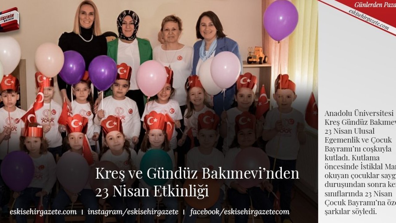 Anadolu Üniversitesi Kreş Gündüz Bakımevi 23 Nisan Ulusal Egemenlik ve Çocuk Bayramı'nı coşkuyla kutladı. Kutlama öncesinde İstiklal Marşı okuyan çocuklar saygı duruşundan sonra kendi sınıflarında 23 Nisan Çocuk Bayramı'na özel şarkılar söyledi.