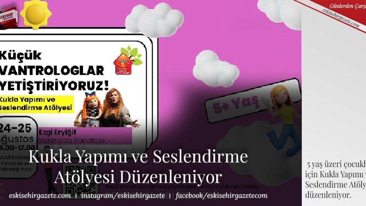 5 yaş üzeri çocuklar için de Tepebaşı Sağlıklı Kent Konseyi iş birliği ile Küçük Vantrologlar Yetiştiriyoruz sloganıyla Kukla Yapımı ve Seslendirme Atölyesi yapılacak. Vecihi Hürkuş Havacılık ve Teknoloji Parkı'nda gerçekleştirilecek olan atölye, 24-25 Ağustos'ta 14.00-17.00 saatleri arasında Vantrolog Sanatçısı Ezgi Eryiğit eğitmenliğinde düzenlenecek.