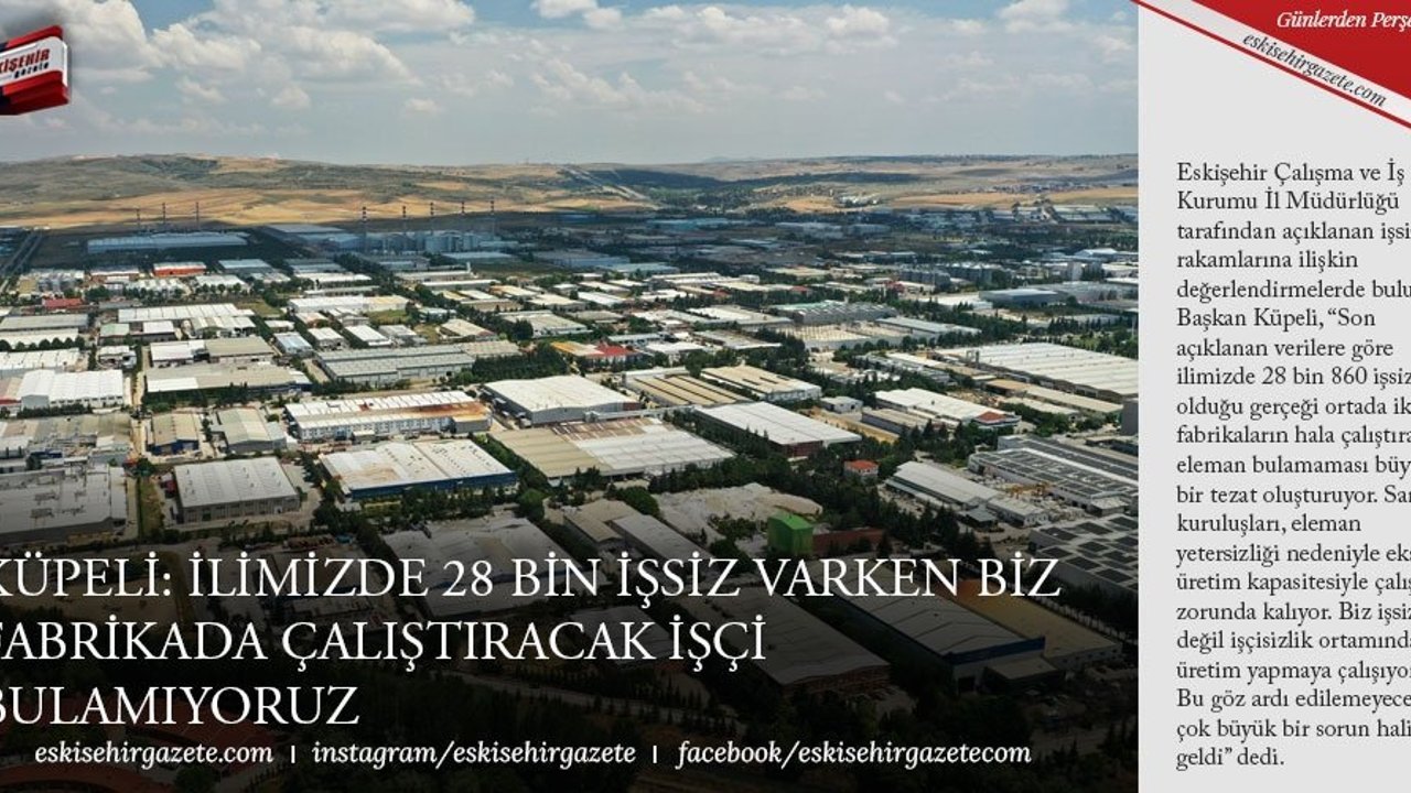 Eskişehir Çalışma ve İş Kurumu İl Müdürlüğü tarafından açıklanan işsizlik rakamlarına ilişkin değerlendirmelerde bulunan Başkan Küpeli, 'Son açıklanan verilere göre ilimizde 28 bin 860 işsiz olduğu gerçeği ortada iken, fabrikaların hala çalıştıracak eleman bulamaması büyük bir tezat oluşturuyor. Sanayi kuruluşları, eleman yetersizliği nedeniyle eksik üretim kapasitesiyle çalışmak zorunda kalıyor. Biz işsizlik değil işçisizlik ortamında üretim yapmaya çalışıyoruz. Bu göz ardı edilemeyecek çok büyük bir sorun haline geldi' dedi.