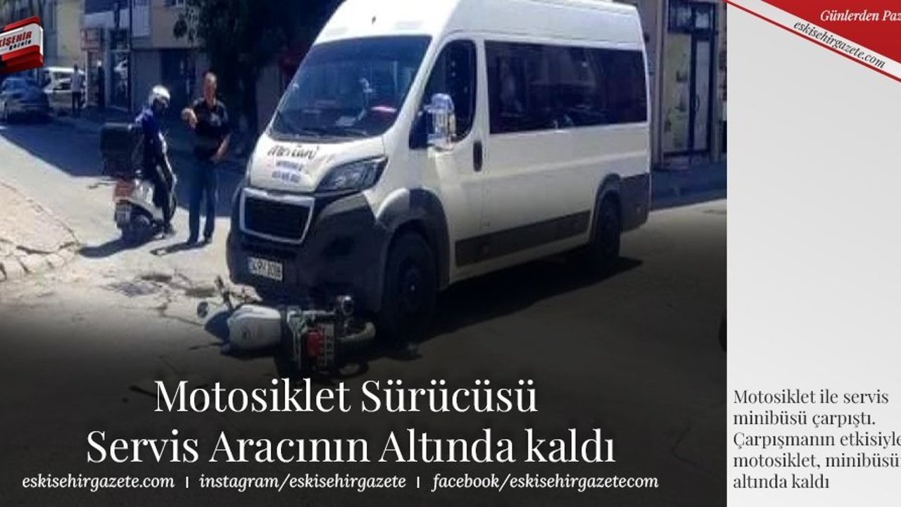 Eskişehir'de servis aracının altında kalan motosikletin sürücüsü yaralanarak hastaneye kaldırıldı.