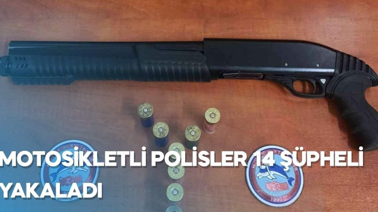 Edinilen bilgilere göre, Asayiş Şubesi Müdürlüğü'ne bağlı Motosikletli Polis Timleri Amirliği ekiplerince kamu düzeninin sağlanması amacıyla çalışma düzenlendi. Suç ve suçlularla mücadele kapsamında yapılan çalışmalar sonucu, 12 adet ruhsatsız tabanca ve bu tabancalara ait 105 adet mermi, 3 adet pompalı tüfek ile bu tüfeklere ait 8 adet mermi, 1 adet çalıntı motosiklet, 1 adet kuru sıkı tabanca ele geçirildi. Ayrıca yapılan çalışmada çeşitli suçlardan aranması bulunan 14 şüpheli yakalandı yakalandı.