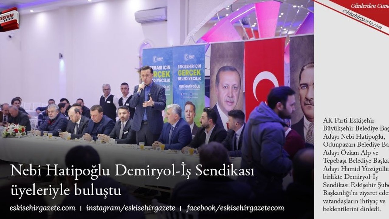 AK Parti Eskişehir Büyükşehir Belediye Başkan Adayı Nebi Hatipoğlu, Odunpazarı Belediye Başkan Adayı Özkan Alp ve Tepebaşı Belediye Başkan Adayı Hamid Yüzügüllü ile birlikte Demiryol-İş Sendikası Eskişehir Şube Başkanlığı'nı ziyaret ederek, vatandaşların ihtiyaç ve beklentilerini dinledi.