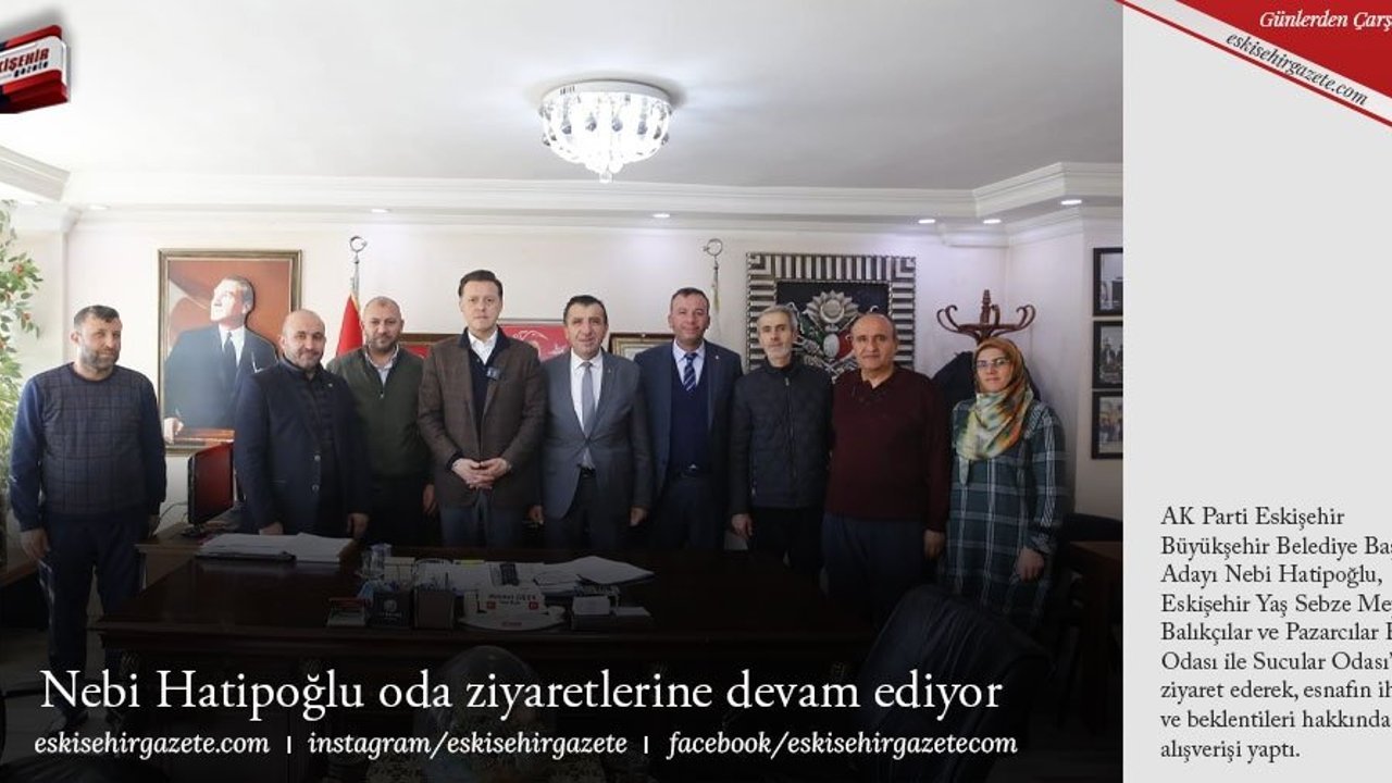 AK Parti Eskişehir Büyükşehir Belediye Başkan Adayı Nebi Hatipoğlu, Eskişehir Yaş Sebze Meyve Balıkçılar ve Pazarcılar Esnaf Odası ile Sucular Odası'nı ziyaret ederek, esnafın ihtiyaç ve beklentileri hakkında bilgi alışverişi yaptı.