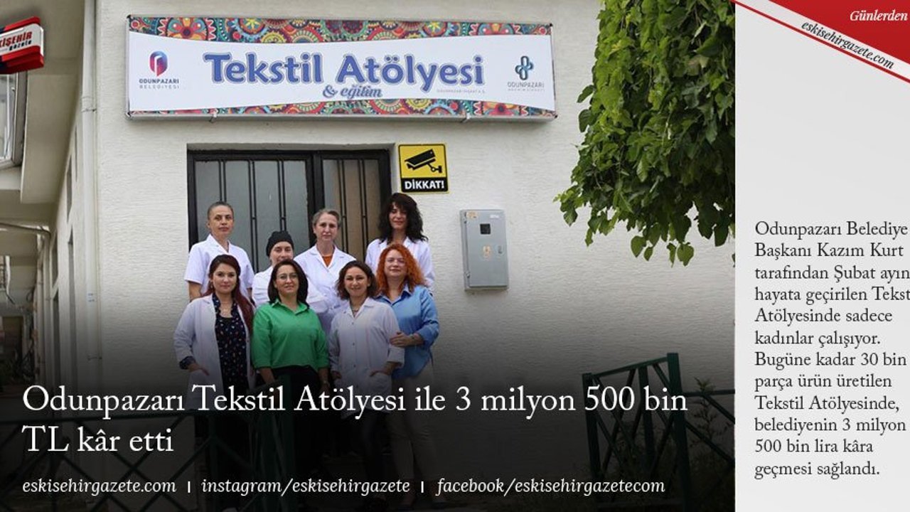 Odunpazarı Belediye Başkanı Kazım Kurt tarafından Şubat ayında hayata geçirilen Tekstil Atölyesinde sadece kadınlar çalışıyor. Bugüne kadar 30 bin parça ürün üretilen Tekstil Atölyesinde, belediyenin 3 milyon 500 bin lira kara geçmesi sağlandı.