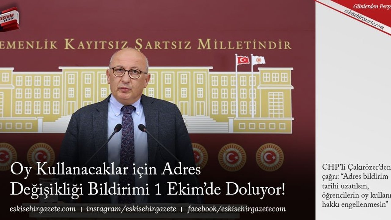 CHP Eskişehir Milletvekili Utku Çakırözer 31 Mart'ta yapılacak yerel seçimlerde bulundukları şehirlerde oy kullanmak isteyen yurttaşlar ile öğrencilerin mağdur edilmemesi için, son tarih 1 Ekim olan adres değişikliği bildirim süresinin uzatılması çağrısında bulundu Yerel seçimlerde oy kullanmak isteyen yurttaşları adres değişikliği bildirimi konusunda da uyaran Çakırözer, 'Bu süre Pazar günü doluyor. Okumak için şehrimize gelen, gelecek olan öğrencilerimizin şehrin yönelitmesinde söz sahibi olmaları hakkı. Şehirimizde üniversite okuyan tüm gençlerimiz e-devlet ya da nüfus müdürlükleri üzerinden ikametini Eskişehir'e taşıyabilirler. Oylarını Eskişehirimizde kullanabilirler' dedi.