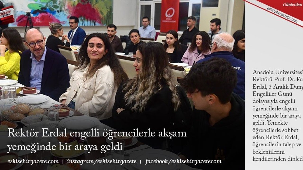 Anadolu Üniversitesi Rektörü Prof. Dr. Fuat Erdal, 3 Aralık Dünya Engelliler Günü dolayısıyla engelli öğrencilerle akşam yemeğinde bir araya geldi. Yemekte öğrencilerle sohbet eden Rektör Erdal, öğrencilerin talep ve beklentilerini kendilerinden dinledi.