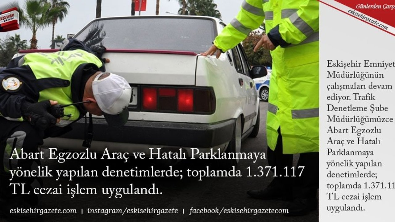 Eskişehir Emniyet Müdürlüğünün çalışmaları devam ediyor. Trafik Denetleme Şube Müdürlüğümüzce Abart Egzozlu Araç ve Hatalı Parklanmaya yönelik yapılan denetimlerde; toplamda 1.371.117 TL cezai işlem uygulandı.