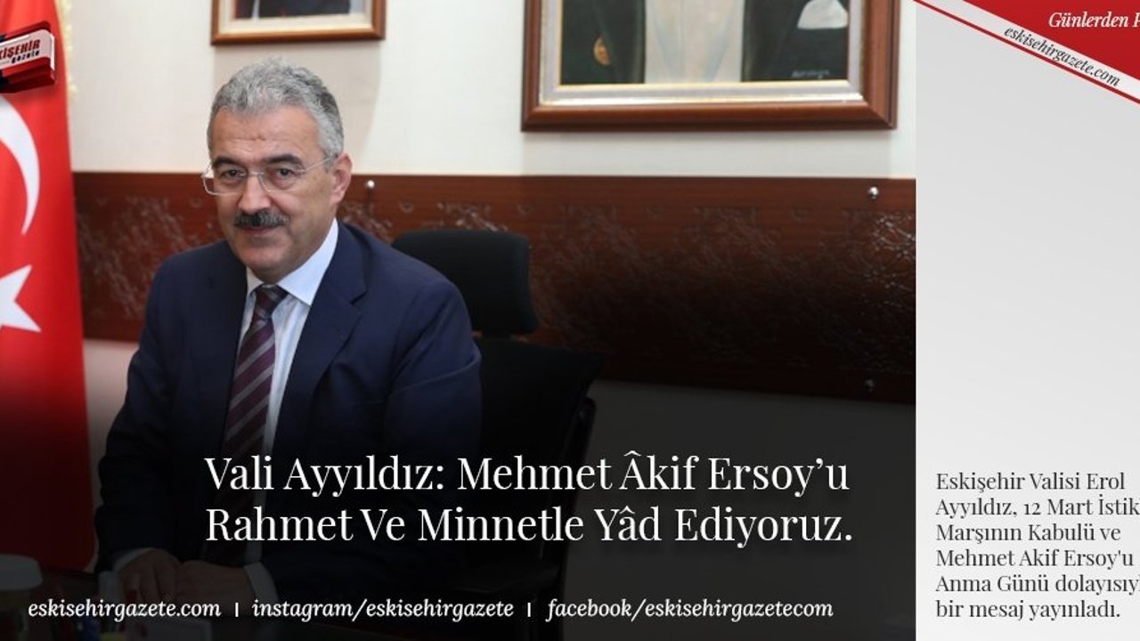 Eskişehir Valisi Erol Ayyıldız, 12 Mart İstiklal Marşının Kabulü ve Mehmet Akif Ersoy'u Anma Günü dolayısıyla bir mesaj yayınladı.
