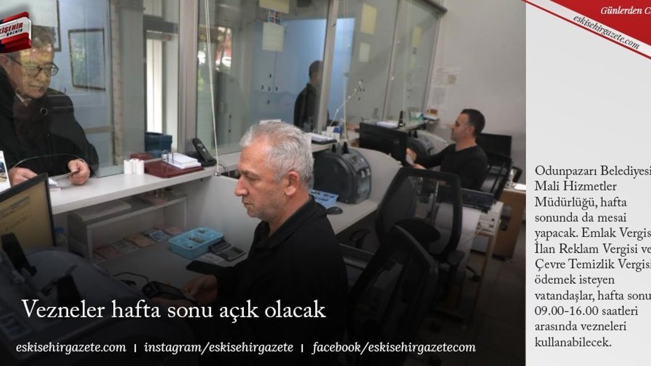 Odunpazarı Belediyesi Mali Hizmetler Müdürlüğü, hafta sonunda da mesai yapacak. Emlak Vergisi, İlan Reklam Vergisi ve Çevre Temizlik Vergisi'ni ödemek isteyen vatandaşlar, hafta sonu 09.00-16.00 saatleri arasında vezneleri kullanabilecek.