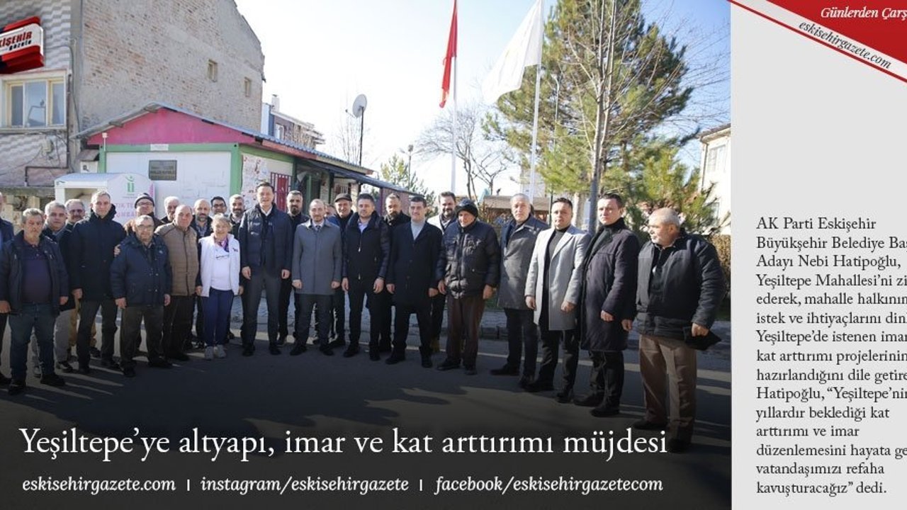 AK Parti Eskişehir Büyükşehir Belediye Başkan Adayı Nebi Hatipoğlu, Yeşiltepe Mahallesi'ni ziyaret ederek, mahalle halkının istek ve ihtiyaçlarını dinledi. Yeşiltepe'de istenen imar ve kat arttırımı projelerinin hazırlandığını dile getiren Hatipoğlu, 'Yeşiltepe'nin yıllardır beklediği kat arttırımı ve imar düzenlemesini hayata geçirip, vatandaşımızı refaha kavuşturacağız' dedi.
